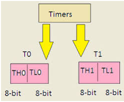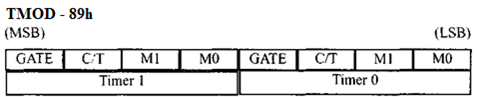 Experiment 7 8086 Programming by Ravinder Nath Rajotiya - April 17, 2019May 25, 20220 Share on Facebook Share Send email Mail Print Print Table of Contents Toggle AIM: Write a Program to generate a square wave of 10 kHz using Timer 1 in mode 1(using 8051)Objective:System Requirement:Setting up the System:TheoryTimer: In timer mode, it is used to provide hardware delay.Counter Mode: In counter mode, it is used to count the events at the external input.SFR for timer/counter OperationTMOD Register: This SFR is an 8-bit register, the upper and the lower nibble of this register is used to set varios mode of operation for both timers. Upper nibble is used for Timer-1 and lower nibble sets the Timer-0 mode. Figure 2 shows the configuration of TMOD register and it is to be noted that this register is not bit addressable, it is byte addressableTimer Control (TCON) Register (SFR Address- 88h)Timer Count RegisterCalculation of Count ValueFlow Chart (For Timer-0 Mode-1)AlgorithmExplanation of the CodeExecution:Viva Questions:Q1. Name the SFR register used for timer/counter operationQ2. What is the function of TMOD register Q.3 : For each of the following crystal input to 8051, find the value of the count to be set in counter TH1 and TL1 to generate 50Hz square wave pulse (i) 12MHz (ii) 11.0592MHzQ4: For a XTAL of 11.0592 MHz connected to 8051 controller, what value is required to be loaded into the timer’s registers to have a time delay of 5 ms?Q5: For 8051 controller operating at external XTAL frequency of 11.0592MHz, write a program to generate 50Hz square pulse on pin 2.3 using programmed i/o methodQ6: For the following program, find the time delay in generated by the time. Assume the XTAL frequency of 8051 is 11.0592MHz AIM: Write a Program to generate a square wave of 10 kHz using Timer 1 in mode 1(using 8051) Objective: The objective of this experiment is to: Understand the difference between Timer and Counter operation To Understand and analyze the use of different SFRs registers e.g. TMOD, TCON, IE To calculate the value of count to be set in TH and TL SFR To develop the algorithm for generating the square wave pulse To develop the program to generate the square wave pulse. System Requirement: 8051 microcontroller Kit, CRO/DSO Setting up the System: Ensure that standard IBM PC/AT system keyboard is connected System is Powered ON Student has a handy opcode table for programming CRO Connected to Port pin 2.3 Theory The 8051 has two timers: Timer 0 and Timer 1. Both are 16-bit and can work as a timer or counter. The selection can be made by C/T’ pin; if this pin is grounded, it acts as timers. If this pin is connected to high, it is used as counter. Timer: In timer mode, it is used to provide hardware delay. Counter Mode: In counter mode, it is used to count the events at the external input. Figure 7.1: Timer Control Figure-1 shows that internally the clock frequency is divided by 12 (because 8051 take 12 clock pulse to complete one machine cycle. So if 12MHz crystal is attached as the clock to 8051, internally only 12MHz/12 = 1MHz goes to the clock circuit. The clock input to the timers They can be used either as timers or as event counters. 8051 use the following registers for the setting the operation of the timers/counters. T1/0 Pin is an external input when used as counter Gate pin decides whether external control is required for time/counter operation INT0’ is an interrupt TR0/TR1 is used to start/stop the timer/counter SFR for timer/counter Operation 8051 uses the following SFR for its operation, these are: Timer Mode (TMOD) Register Timer Control (TCON) Register IE (Interrupt Enable ) Register 16-bit Count Register (TH1/TH0, TL1/TL0) These are explained below: TMOD Register: This SFR is an 8-bit register, the upper and the lower nibble of this register is used to set varios mode of operation for both timers. Upper nibble is used for Timer-1 and lower nibble sets the Timer-0 mode. Figure 2 shows the configuration of TMOD register and it is to be noted that this register is not bit addressable, it is byte addressable Figure 7.2 TMOD Register Input Function GATE Gate Control Input. When set (Gate=’1’), then when C/T’=’1’, counter operation is controlled external events and not by TR bit. When Gate is cleared ie. =’0’, then, timer/counter is controlled (start/stop) by software instruction When TR is set the timer starts and when clear timer stops. The instructions are SETB TR1/TR0 AND CLRB TR1/TR0 C/T’ When ‘1’ act as counter, when ‘0’ act as timer M1M0 M1 M0 Mode 0 0 Mode-0, 13-bit, TH used as 8-bit timer and TL as 5-bit prescalar 0 1 Mode-1, 16-bit timer/counter 1 0 Mode-2, 8-bit Auto reload 1 1 Mode-3, split mode Timer Control (TCON) Register (SFR Address- 88h) This is the timer control register. It is a bit addressable; individual bit of this registers can be set or cleared by accessing the bits by their name or their address. The register configuration is shown in figure-3 Figure 7.3: TCON Register Bit Function TF1 Timer-1 Overflow Flag, Set when counter from FFFF to 0000h. Its ISR is at 001Bh, TF1 cleared, when processors executes the ISR from address 001Bh TR1 This bit is used to start / stop the timer-1. Start when set, stops when cleared. TF0 Timer-0 Overflow Flag, Set when counter from FFFF to 0000h. Its ISR is at 000Bh, TF0 cleared, when processors executes the ISR from address 000Bh TR0 This bit is used to start / stop the timer-0. Start when set, stops when cleared. IE1 Interrupt1 edge flag, set by hardware when interrupt on INT1 pin occurred and cleared by hardware when an interrupt is processed . It is external input, its ISR is located at 0013h IT1 This bit selects external interrupt event type on INT1 pin. ‘1’ sets interrupt on falling edge, and ‘0’ to set on low level IE0 Interrupt0 edge flag, set by hardware when interrupt on INT0 pin occurred and cleared by hardware when an interrupt is processed. It is external input, its ISR is loc