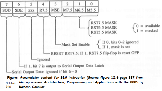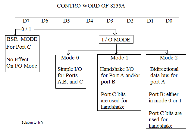 Solution to MPMC may 2019 GGSIPU Microprocessors by Ravinder Nath Rajotiya - December 16, 2020May 27, 20210 Share on Facebook Share Send email Mail Print Print Solution for End Term Examination 2019 1(a) Is there some minimum pulse width required for the INTR signal in case of 8085 microprocessor? Explain with reason. 3 Solution: Assuming 8085 microprocessor based system running at 3 MHz clock frequency T = 1/3 x 106 = 0.333 μs 8085 checks INTR, one clock period before the last T-state of an instruction cycle. In 8085, CALL instruction requires 18 T-states. ∴ INTR pulse should be high at least for 17.5 T-states So, minimum pulse width of the INTR signal to be recognized successfully = 17.5 x 0.33 x 10-6 = 5.8 μs long. Q1.b Explain how many time the following loop will be executed 3 LXI B, 000Bh Loop : DCX B JNZ Loop Answer: LXI instruction loads the register pair BC with 000B which is 11. Inside the loop BC is first decremented i.e. now C=10, Because of the condition JNZ the loop executes 10 times. Q1.c Write the program to generate a delay of 1 ms in 8086 microprocessor 3 Solution: assuming 8086 microprocessor operating at 5 MHZ Total T states in loop 21 Number of clock cycles for execution of the loop once (m) = 2 + 3 + 16 = 21 Time required for the execution of loop once = m X T = 21 X 1/(5 X 10^6) = 4.2 µs Count = td/(m X T) = 1 X 10^-3 /(4.2 X 10^-6) = 238 = EEh Program to give 1 ms delay COUNT EQU EEh MOV CL, Count 4 T States L1 : DEC CX 2 NOP 3 JNZ L1 16 1.d Explain the usefulness of “TEST” and “LOCK” instruction in 8086 microprocessor. 3 Solution: LOCK’ : Its an active low pin. It indicates that other system bus masters have not been allowed to gain control of the system bus while LOCK’ is active low(0). The LOCK signal will be active until the completion of the next instruction. TEST’ : This examined by a ‘WAIT’ instruction. If the TEST pin goes low(0), execution will continue, else the processor remains in an idle state. The input is internally synchronized during each of the clock cycle on leading edge of the clock. 1.e Write the important features of 8251(USART) IC 3 Solution: It is a 28 pin DIP Chip It takes data serially from peripheral (outside devices) and converts into parallel data.and vice versa It is a programmable chip with 16-bit control register with which it can be programmed Modem control unit to helps the computers to communicate over telephone lines or cable wires Transmit control unit to control the data transmission 1.f What are different operating modes of 8255 PPI 4 Solution: Bit Set/Reset (BSR) Mode: Used to set or rest the Port-C bits Input/Output (I/O) Mode: This mode is further of following types Mode-0: All the three ports PA,PB,PC act as simple 8-bit I/O ports Mode-1: 8255 in mode-1, permit port PA and PB in 8-bit port with handshake. The handshake signals being carried by port PC. PCupper controls the PA and PClower controls port PB. Mode-2: 8255 in mode-2 act as bidirection on Port PA with handshake signals on port PC and PB act as simple I/O port 1.g) What are different two-operand logical instructions used in 8051 microcontroller 3 Solution: Logical ANL, ORL and XRL act as two-operand instructions in 8051. They support all addressing modes. Syntax: OPCODE operand-1, Operand-2 Examples: The above syntax is valid for ANL, ORL and XRL. Sample example is given below XRL A, #immd ORL A, @Ri ANL A, Rn XRL A, direct 1.h) Write main drawback of microprogrammed control 3 Solution: This is slower than the hardwired control unitbecause the microinstructions are to be fetched from the control memory which is time-consuming. Expensive for small designs Table of Contents Toggle Unit-1UNIT-II Unit-1 Q2.a) if 8085 has fetched the machine code located at the memory location 205Fh, specify the content of the program counter. 5 Solution: The PC is a 16-bit pointer regiser which points to the address of the next instruction while the current instruction is being fetched. So, when the current instruction at address 205F was being fetched the PC was pointing to 2060h. But as per the question 8085 has fetched the instruction, so the 8085 is in the process of fetching the instruction at address 2060H and as a result of its nature, the PC will be pointing to 2061h Content of PC is therefore= 2061h Q2.b) What are the different control signals and status signals in case of 8085 microprocessor? Explain the function of each one. 5 Solution: various control and status signal on 8085 microprocessor are: ALE, WR’, RD’, IO/M’, READY, RESET-IN’ ,S1, S0 ALE : It helps in demultiplexing the lower order address and data bus. This signal goes high during the first clock cycle and enables the lower order address bits. The lower order address bus is added to memory or any external latch READY is used by the microprocessor to check whether a peripheral is ready to accept or transfer data. These peripherals are connected to microprocessor using the READY pin. If READY is high then the periphery is ready for data transfer. If not the microprocessor waits until READY goes high. RESET-IN’ : This pin resets the program counter to 0 and resets interrupt enable and HLDA flip-flops. The CPU is held in reset condition until this pin is high. IO/M’ S1 S0 Status 0 0 1 Memory Write 0 1 0 Memory read 1 1 0 IO read 1 0 1 IO Write 0 1 1 Opcode fetch Q2.c) Can an input port and an output port have the same port address? Justify your answer. 2.5 Solution : Yes port can also act as a bidirectional port. A port can be connected to a memory unit. A memory has both theread and write operation. Therefore it is possible to make a port as input and output port. In microcontroller we have a provision of programming the port for the direction operation. When we write FF to a port the will become as an input port. Thus a port can act as an input as well as an output port but one operation at a time a read or a write to a port. Q3.a) Write a program for 8085 microprocessor to add 
