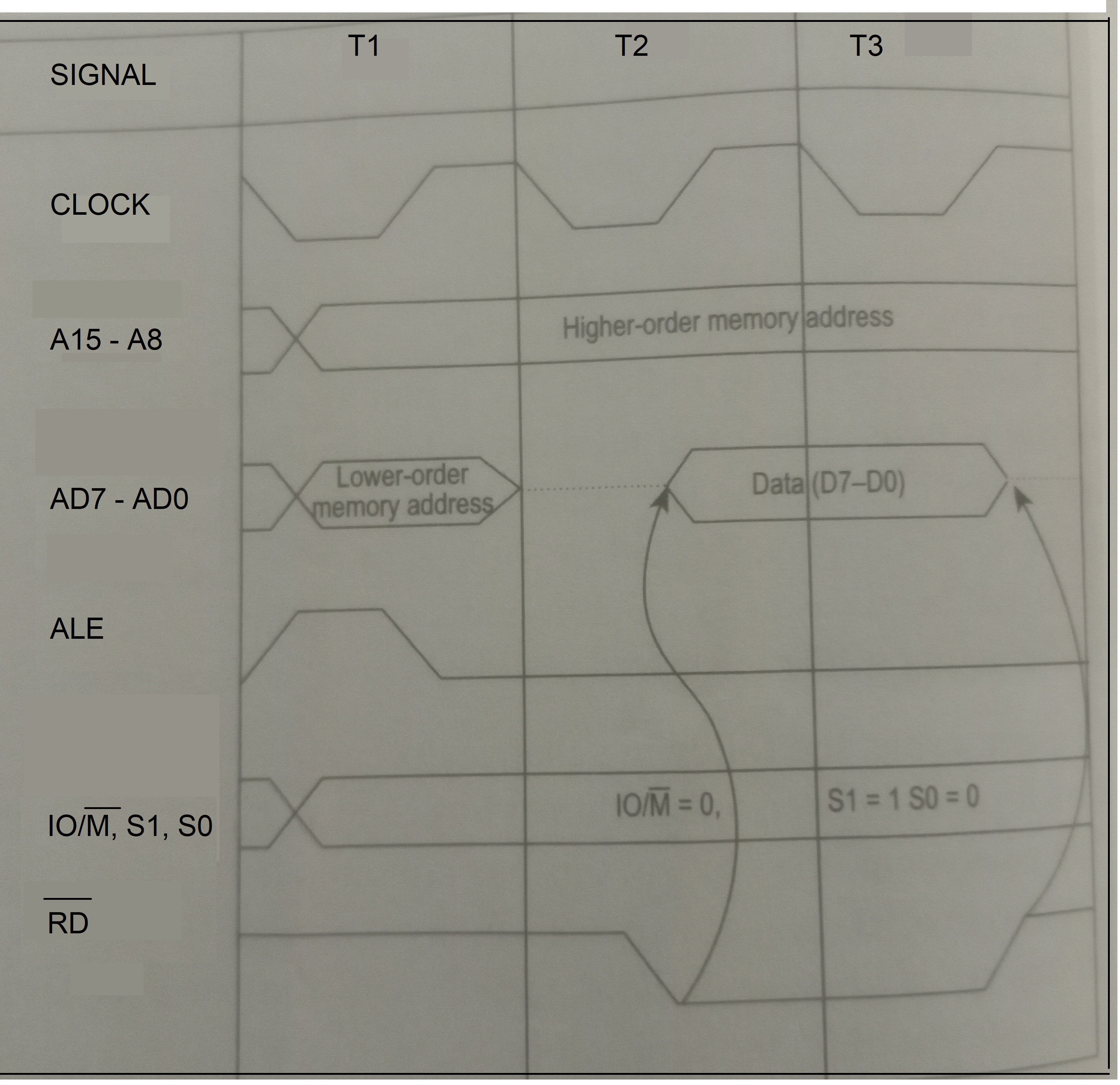 Timing Diagram 8085 8085 Microprocessor by Ravinder Nath Rajotiya - September 23, 2021February 23, 20220 Share on Facebook Share Send email Mail Print Print Timing Diagram 8085 Microprocessor A timing diagram of a microprocessor depicts graphically the activities that are taking place at different instants of time (T states) inside the microprocessor. As discussed previously, microprocessor fetches an instruction from the memory, decodes it, fetches the operands if required and then executes the instruction. An execution of a instruction may take one to six machine cycles and a machine cycle may contain three or more T states. Before we study the timing diagram, the following terminologies should be clear. Instruction cycle – It is the total time by the microprocessor to fetch, decode, fetch operands and execute the instruction. Machine Cycle – It is time taken by the processor in completing the single task, for example fetching an OPCODE, Writing data to memory, or reading operands from the memory. T States – One clock period is referred to as one T states. It is the basic unit used to calculate the time taken by the processor in execution of an instruction or a program. Background: Address Demultiplexing To communicate the real world entities/peripheral, the address and data lines are first required to be demultiplexed. This is done by use of a latch. The latch is activated by an ALE signal. Input to the latch are the AD lines i.e. AD7 – AD0 as shown in figure below: Figure-1: 8085 address demultiplexing a high signal on th ale activates the latch. This latches the address A7 – A0 at the output of the latch. When the ALE signal is LOW, the AD7-AD0 lines can be used as data bus D7 – D0 so that they can be used for data transceiver. Timing Diagram: As said, the timing diagram depicts graphically the activities that are taking place at different instants of time (T states) inside the microprocessor. The figure below shows the timing diagram for an OPCODE fetch operation Figure-2: 8085 timing diagram OPCODE fetch At time T1 – the ALE signal goes high, this activates the 8-bit latch so that the address A7 – A0 is latched at the output of the latch At time T2, the ALE signal goes LOW, and we see that the same lines now become the data bus D7 – D0 At this time the complete 16-bit address A15-A0 is available on the address bus. Now the processor puts a –ve going pulse on IO/M’ and RD’. This selects the memory unit for read operation. And the OPCODE from the address on the address bus is placed on the data bus. Decoding the IO/M’ and the status lines The IO/M’ along with the S0, S1 lines gives the status of the processor, what type of operation is being done inside the processor. These operations are: IO/M’ S1 S0 Operation or the processor status Z “ High Impedance” 0 0 HLT 0 0 1 Memory Write 0 1 0 Memory Read 0 1 1 Opcode Fetch 1 0 0 X invalid 1 0 1 IO write 1 1 0 IO Read 1 1 1 Interrupt Acknowledge So now we can draw the IO/M’ and S1 and S0 lines also in the timing diagram. Example – Instruction Cycle for ADI AL, 56h The timing diagram example for ADI 56 consist of two machine cycle OPCODE fetch cycle Memory read cycle. The memory read cycle for the operand read is somewhat similar to OPCODE fetch operation, but requires only three T states. The instruction ADI 56h is translated in the machine code as C6, 56 a two byte instruction stored in memory at two locations say: Opcode C6 at address 2001 Operand 56 at address 2002 Figure-3: Timing Diagram for the instruction ADI 56 OPCODE fetch cycle (M1) During machine cycle M1, the opcode C6 from address 2001 is read into the IR. This takes one machine cycle (M1) consisting of four T states T1 to T4. Memory Read Operation Machine Cycle M2 represents the memory read operation of shown in the timing diagram. During T1 of M2 cycle, ALE signal goes HIGH to enable the latch and low byte address is latched at the output of the latch. The high byte of the address is already available on high order address bus. So during T1, full 16-bit address is on the address bus. During T2, the IO/M’ =0, and S1,S0 =10 indicating M2 is a memory read cycle. The data from address 2002 is put on the address bus and read into the processor. Exercise: Construct the timing diagram for the instruction LDA 4200h Answer Hint: This instruction requires four machine cycles consisting of 13 T states to execute. This is a 3 byte instruction stored as OPCODE followed by 16-bit address. Suppose the instruction is stored in memory starting from address 2000h as: Opcode 3A Low order address 00 High byte address 42 The four machine cycles are: M1 consist of 4 T states to fetch the OPCODE from address 2000h M2 consist of 3 T states to fetch the low byte of address from location 2001 M3 consist of reading high byte from address 2002 M4 consist of 3 T states to read the data from address constituted in above 2 steps and put it into the accumulator Memory Read Cycle: The fetching the data from the memory is done during the memory read cycle. The memory read cycle is similar to the op-code fetch cycle with the exception that : the read cycle take 3-T states the status and control signals IO / M’ S1 S0 WR’ RD’ 0 1 0 1 0 Memory Write Cycle. This cycle is executed by the microprocessor when a data byte is to be written to memory. It take 3 T states to execute this cycle. It is executed when: The control and status signals are : IO / M’ S1 S0 WR’ RD’ 0 0 1 0 1 Share on Facebook Share Send email Mail Print Print