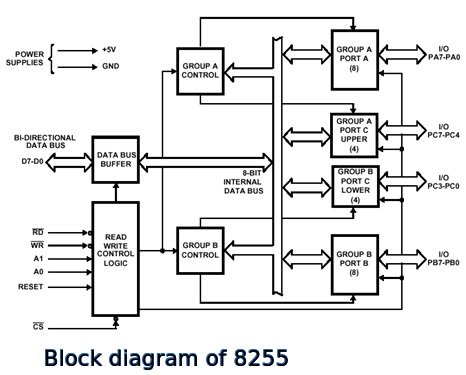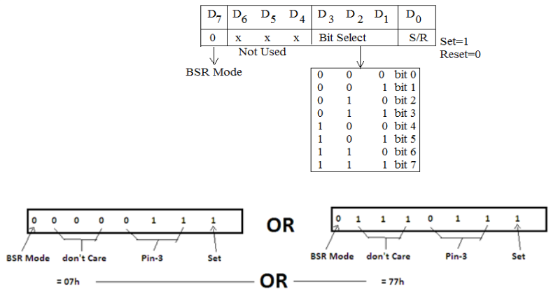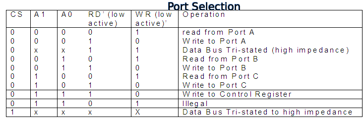 8255 PPI(Programmable Peripheral Interface) Microprocessor and Interfacing by Ravinder Nath Rajotiya - March 26, 2020April 21, 20220 Share on Facebook Share Send email Mail Print Print Table of Contents Toggle 8255 Programmable Peripheral InterfaceFeatures of the 8255:PIN diagram of 8255Block Diagram of 8255Data bus buffers:Read/write Control unit :GpA and GpB control units:Ports -PA, PB, PC:Port Selection:Chip Select and Port addresses for interfacing with 8086Operating Modes of 8255Control Word formatBit set-Reset (BSR) ModeI/O Mode of operation 8255 Programmable Peripheral Interface 8255 is a programmable peripheral interface IC which is used as an interface between the external device and the microprocessor for parallel communication. This IC is a 40-pi IC having three ports known as Port-A(PA), Port-B(PB) and Port-C(PC). these ports can operate in various modes. the complete details is given in the following PPTSs. Features of the 8255: It provide three I/O ports All the three I/O ports are latched Port operation is configurable by programming 8255 i.e. writing a control word in CWR BSR- bit set-reset mode allows individual pins of port C to be controlled to be set or reset. PIN diagram of 8255 8255 PPI is a 40-pin IC, it has three 8-bit ports named PA, PB and PC. It operates on a single +5V power supply. PIN numbers PIN name PIN Functions 7, 26 GND, Vcc Power supply pins PIN 4 to 1 and PIN 40 to 37 PA(3-0) and PA(4-7) Port A pins pin 10 to 13 and pin 14 to pin 17 PC(7-4) and PC(0-3) Port C pins Pin 18 to pin 25 PB (0-7) Port B pins Pin 5,6,8,9, 35,36 RD’, CS’, A1, A0, Reset, WR’ Control signals- read,chip select and port/cw address bits, reset and write pins Pin 34 to pin 27 D(0-7) Data pints from/to microprocessor Block Diagram of 8255 Block Diagram of 8255 8255 is a general purpose programmable peripheral interface. Different com ponents of the 8255 are explained below: Data bus buffers: This unit is used to communicate with the data bus of the microprocessor. It is also connected to the internal bus of the 8255 so that the data can be received or transmitted from or to any of the three ports. Figure-2: 8255 block diagram Read/write Control unit : This unit contains all the control signal and the control word. The control signals are: read (RD’), write(WR’), port address(A1,A0), RESET and chip select (CS’). CS’ signal is generate by logic gates or decoder using the address bit specified for the operation of the 8255. GpA and GpB control units: These units are used to carry the contro signals for the three ports PA, PB, PC Ports -PA, PB, PC: 8255 has three ports which have their inputs and outputs latched. Threse ports can be controlled for different modes of operations. Control word can be written in the control word register for setting the mode of operations. Port Selection: Port selection address depend on whether the data bus of the 8255 is to be connected to lower or upper data bus of the 8086 microprocessor. For transmission on the low order data bus (D0-D7) the port address to be generated must be even address. But if the data is to be communicated over high order data bus (D8-15) the port address to be generated must be odd address. However for 8085 microprocessor the port address can be contiguous addresses. Figure-3: 8255 port selection Chip Select and Port addresses for interfacing with 8086 Assuming the data buffer of 8255 connected to low-order data bus of 8086. three ports and control word addresses must be the even address. For generating these even addresses, address line A0 from 8086 must be used in chip select CS’ generation. Assume 8-bit port addresses, A1,A0 pins of 8255 must be connected to A2,A1 address lines of the 8-address lines A7-A0 of 8086. There could be different combinations of addresses, one such address combinations may be: A7 A6 A5 A4 A3 A2 A1 A0 Port Address PORT selected 0 1 0 0 0 0 0 0 40h PA 0 1 0 0 0 0 1 0 42h PB 0 1 0 0 0 1 0 0 44h PC 0 1 0 0 0 1 1 0 46h CW Operating Modes of 8255 8255 has three ports which can operate on different modes selected by writing a control word in its control register (CWR). Broadly the modes are classified as : BSR – bit set reset mode : This mode is used to set or reset the port ‘C’ pins. I/O Mode – There are three i/o modes. These are Mode-0, Mode-1, Mode-2 Mode 0 Basic Functional Definitions: (i) Two 8-bit ports and two 4-bit ports, Any Port can be input or output (ii)Outputs are latched (iii) Input are not latched Mode1BasicFunctionDefinitions: (i) Group A and Group B i/o with and Port C 4-bit control/data port for PA and PB (ii) Both inputs and outputs are latched. (iii) The 4-bit ports of PC is used for control and status of the 8-bit port. Mode 2 Basic Functional Definitions : (i) Gp-A used as 8-bit, bi-directional bus with port-C as 5-bit control bits (ii)The 5-bit control port (Port C) is for the 8-bit, bi-directional bus port (Port A) (iii) Both inputs and outputs are latched Control Word format D7 D6 D5 D4 D3 D2 D1 D0 Mode Set GpA mode Select PA I/O Port-C upper PCL I/O GpB mode control PB I/O Port-C lower PCL I/O 0- BSR 1-I/O 0 0 Mode-0 0 1 mode-1 1 X Mode-2 0 – o/p 1 – i/p 0 – o/p 1 – i/p 0 – Mode-0 1- Mode-1 0 – o/p 1 – i/p 0 – o/p 1 – i/p Bit set-Reset (BSR) Mode Bit Set/Reset (BSR) Mode of Operation : BSR mode is used for Port-C to control read/write operation on individual pins of port C. The control word of the BSR mode is shown in figure Figure- 8255 BSR mode I/O Mode of operation The IO mode is used for reading and writing from or to IO device. The read write operations to/from IO devices can be performed in different modes. The control word setting for the IO mode is shown Figure 8255 I-O Mode set examples: 8255 Part-1 8255 Part-2 8255 Part-1 8255 Part-2 8255 PPI Part-3 Share on Facebook Share Send email Mail Print Print